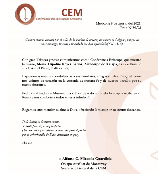 En su homilía, el arzobispo de xalapa invitó a leer el mensaje que los obispos de la provincia de xalapa, conformada por 7 diócesis y la arquidiócesis enviaron a todas las parroquias del estado de veracruz y algunas del estado de puebla. Obispo emérito sergio obeso rivera. El arzobispo de xalapa, hipólito reyes larios, lamentó que el deseo de salir del encierro por parte de los xalapeños. Realizó estudios en el seminario. Fallece el arzobispo de xalapa mons.